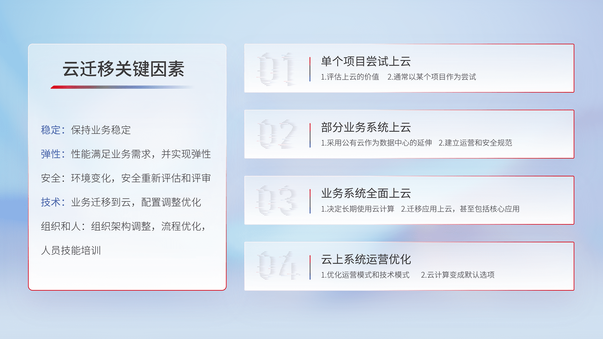 结合实际业务,,,从规划设计、、、、云平台选型、、、云原生改造、、、数据迁移、、集成交付,,,,迁移全过程为客户识别最佳上云路径,,,做好风险识别管理,,,,设计网络架构、、身份权限、、、、安全审计合规、、、、操作审计、、、、日志审计、、、、监控告警策略、、多站点容灾设计等,,,对云上基础设施进行整体规划,,,,提升IT治理水平,,,以满足弹性、、、、高可用、、、、高性能的需求。。。。