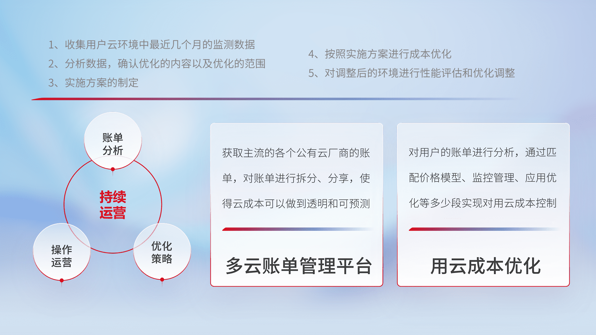 通过多云纳管,,以统一的资源数据模型把客户的云资源进行抽象和封装,,,,进而实现对多云资源的统一操作,,,,保障云资源管理的可靠性、、、、稳定性与可用性。。。。量身定制化运维内容,,配置、、、、开发运维、、、、补丁管理、、、备份、、监控、、、认证和访问管理、、、审计和日常巡检等,,保障在用云过程中的可靠度,,稳定度以及高可用率。。。。